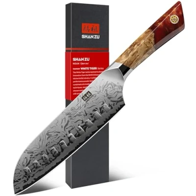 【Japanese SG2 Damascus Steel Core】SHAN ZU Santoku knife is made of Japanese original SG2 powder steel with a hardness of up to 64HRC. Due to their high hardness and wear resistance, SG2 steel knives can stay sharp during prolonged cutting tasks and have a long service life 【Hand Forged 91 Layer Damascus Kitchen Knife】SHAN ZU upgraded this Santoku knife to 91 layers of Damascus steel, which greatly improves corrosion resistance, rust resistance and toughness. Combined with artisans hand forged at 12° on each side, it becomes a super durable and sharp chef knife 【Luxury Pattern Royal Damascus Knife】The charming pattern technique of SHAN ZU Damascus knife involves laying layers of carbon steel blades and applying excessive heat treatments with repeated folding and forging until the blade pattern is formed. This is a real Damascus pattern technology instead of a laser etched one! 【Ergonomic and Elegant Maple Handle】The handle is designed by an excellent designer, using precious natural maple wood, fused with resin and filled with eco-friendly pigments, and specially treated to make it durable and colorful. Ergonomic design provides a comfortable grip 【COLLECTIBLE CHEF KNIFE & WARRANTY】This exceptionally designed 7 inch Santoku knife is worth collecting and comes with a gift box. You can give it to your loved ones and friends. SHAN ZU offers a 5-year warranty service, please contact us if you have any questions