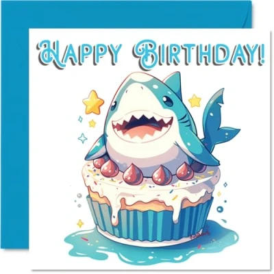 Shark Birthday Cards Animal Cake Happy Card for Son Daughter Brother Sister Grandson Granddaughter Niece Nephew Cousin, 145mm Bday Greeting