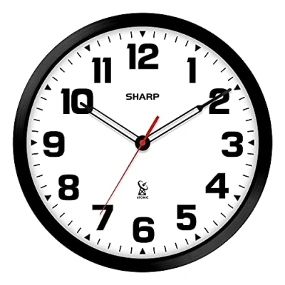 Sharp Atomic Analog Wall Clock 12" Black Stylish Frame Sets Automatically Battery Operated Easy to Read Use Modern Design and Style