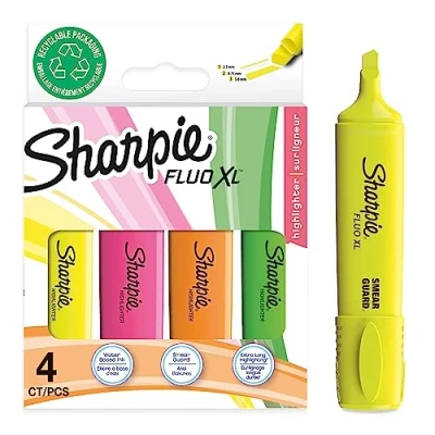 High on colour, the vivid, high-contrast shades add stark emphasis to highlighted text Armed with plenty of ink and a versatile chisel tip, they're perfect for all-day study sessions Smearguard ink technology resists smearing of many pen and marker inks (let ink dry before highlighting) User friendly, quick-drying and odourless AP certified formula Includes: 4 Sharpie highlighters in Fluorescent Yellow, Pink, Orange & Green
