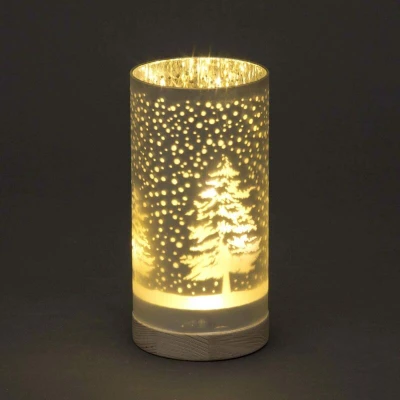 SHATCHI 20cm Christmas Decorated Vase Table Lamp Etched Glass Tube Forest Snowfall Scene Silver Cylinder LED Fairy Lights Battery Operated