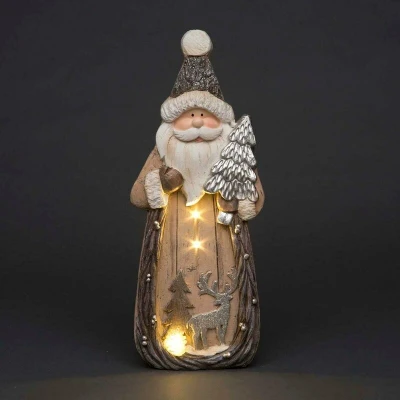 SHATCHI 46cm Santa with Forest Scene Figurine Wood Effect Christmas Resin Battery Operated LEDs Sculpture Home Table Mantelpeice Decorations