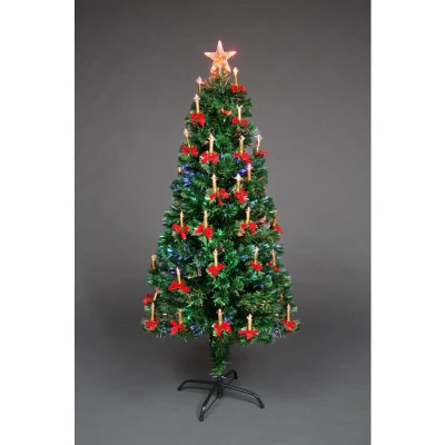 General description Pre-Lit Fibre Optic Christmas Tree creates a stunning effect with minimal effort. It features candle and bow style lights that display multi-colour effects and various automatic lighting patterns without the need for a controller. The attractive colour effects produced by the fibre optics enhance the overall appearance of the tree, making it a beautiful addition to your holiday decorations. Technical specifications Height: 6ft (180 cm) Order Quantity: 1 Base: Stable strong base for 2ft and 3ft trees; metal stand for 4ft and above Other information Please note: Images are for illustrative purposes only.