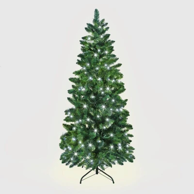 SHATCHI 7Ft/2.1m Pre Lit Green Christmas Slim Pine Narrow Xmas Tree, Pointed Tips, Metal Stand, Cool White LED Lights, Holiday Home Decorations, 210 cm