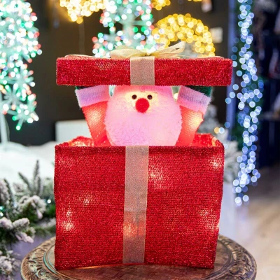 General description Light up your holiday season with this charming Christmas Santa Pop-up Lighted LED Gift Box. This festive decoration features a vibrant red metallic finish and a delightful Santa Claus that pops up from inside the gift box, creating a magical effect for both indoor and outdoor settings. Technical specifications Size: 32cm x 27cm x 27cm Lead length: 2.4m Light type: LED with steady glow Usage This lighted gift box is perfect for adding a festive touch to your home or garden. It can be used to enhance your holiday decorations, creating a warm and inviting atmosphere for family and friends.
