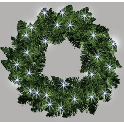 General description Imperial Pine Tips Design Wreath which will give your home a beautiful and attractive Christmas look. You can use it on any size door, fireplace, bedroom, stairs, or walls. Its perfect size will suit all locations. Technical specifications Diameter: 55 cm Color: Green Tips: 120 LED Count: 30 Cool White LEDs Power: Requires 3 x AA batteries