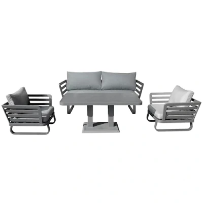 β γππππππππ π-πππππ πππππππ πππ π πππγ: Includes 1ΓLoveseat Sofa (L166ΓD80ΓH62 cm), 2ΓSingle Armchairs (L88ΓD80ΓH62 cm), and 1ΓRising Dining Table (L150ΓD80ΓH70 cm). Perfect garden seating for patio, balcony, or conservatory. β γππππππππππ ππππππ ππππππ πππππγ: Modern rising table allows effortless height adjustment β switch from coffee to dining table by pressing the built-in lever. Designed with durable alum-board top with brushed grey finish. β γπππππππ ππππ-π πππ πππππππππ π ππππγ: Made from lightweight, powder-coated aluminium, ideal for all-weather outdoor use in the UK. Strong, modern build with sleek horizontal slat design. β γππππ πππππ ππππππππ β ππππ ππππγ: Fitted with UKFR-rated spun polyester cushions. The zipped covers are removable and washable, providing deep comfort and practicality for everyday use. β γππππππππππππ πππππππ ππππγ: Sleek, minimalist frame, reclining-style backrest and stylish colour palette. Blends into both modern and traditional garden spaces for stylish lounging & dining.