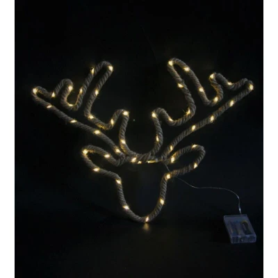 General description Illuminate your holiday season with the Christmas Hemp Rope Deer, a stunning decorative piece that features a stag reindeer head silhouette. These LED hemp rope lights are perfect for adding a festive touch to your home, garden, or wall. Battery operated for convenience, they create a warm and inviting atmosphere for your holiday celebrations. Technical specifications Material: Hemp rope Light type: LED Power source: Battery operated Design: Stag reindeer head silhouette Other information Perfect for indoor and outdoor use, these lights can enhance your holiday decorations and create a magical ambiance.