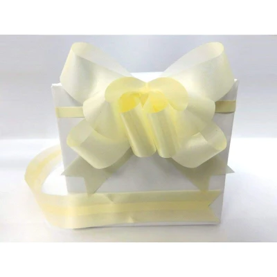 General description Large 30mm/3cm Ribbon Pull Bows in Ivory are perfect for all occasions. This pack contains 60 high-quality pull bow ribbons that create beautiful bows effortlessly. Simply pull the inner ribbon cords to form a stunning bow, tie it off, and attach it using the extra long tie. These bows are waterproof, anti-static, and easy to wipe clean, making them ideal for use with fresh flowers and bouquets. They are commonly used for decorating arrangements, gifts, flower bouquets, and various craft projects for weddings, anniversaries, and birthdays. Technical specifications Size: 30mm (approx. 3" to 4" wide when assembled) Quantity: 60 bows per pack Material: Waterproof and anti-static ribbon Installation Open tails to reveal the tie-strings. Hold the tails open with one hand. Pull the tie-strings with the other hand to form a bow. Tie the strings at the base of the bow.