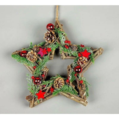 ManoManoGeneral description Versatile Décor: Whether adorning your front door, hanging above the fireplace, or gracing your dining table as a centerpiece, this star-shaped wreath effortlessly elevates the atmosphere and spreads holiday cheer throughout your home. Technical specifications Dimension: 35cm (13.8 inches) Material: Twig & PVC Battery Operated: Requires 2 x AA batteries (not included) Other information Decorated with warm white LED lights, vibrant red baubles, berries, stars, green foliage, and rustic pine cones, bringing the festive spirit to life. Match with other decorations available in the same range.