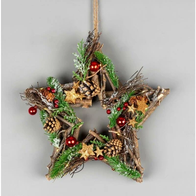 ManoManoGeneral description Versatile Décor: Whether adorning your front door, hanging above the fireplace, or gracing your dining table as a centerpiece, this star-shaped wreath effortlessly elevates the atmosphere and spreads holiday cheer throughout your home. Technical specifications Dimension: 35cm (13.8 inches) Material: Twig & PVC Battery Operated: Requires 2 x AA batteries (not included) Usage Decorated with warm white LED lights, vibrant red baubles, red berries, shimmering bronze stars, green foliage, and rustic pine cones, this decoration brings the festive spirit to life. Other information Match with other decorations available in the same range.