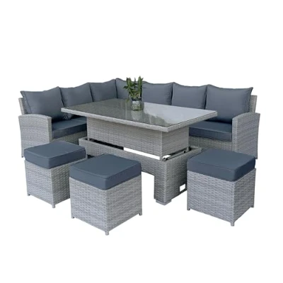 SHATCHI Rattan Garden Furniture Set with Rising Table 8 Seater Outdoor Corner Sofa Dining Adjustable and Footstools Steel Frame Patio Cushions Grey Wicker