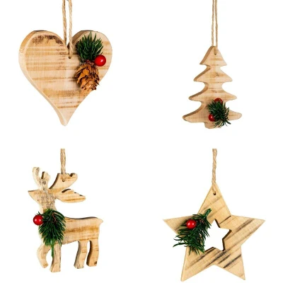 SHATCHI Rustic Star, Reindeer, Heart Tree Decorations Christmas Wooden Festive Ornaments Hanging Xmas Pendants DIY Crafts Gifts, Wood, Assorted 4Pcs