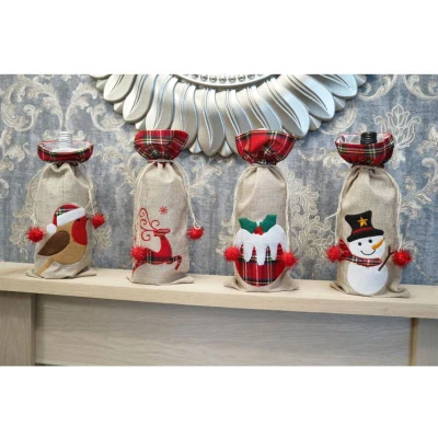 SHATCHI Wine Bottle Liquor Cover Bag with Drawstring Printed Pattern Burlap Hessian Linen Novelty Dinner Table Decorations Reindeer/Snowman/Robin/Christmas Pudding