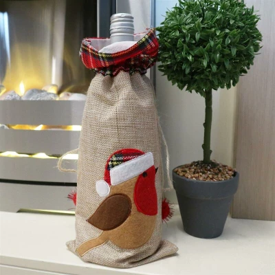 General description This Christmas Wine Bottle Cover features a charming robin design, perfect for adding a festive touch to your holiday gatherings. Made from burlap hessian linen, it combines durability with a rustic aesthetic. The drawstring closure ensures a snug fit around your wine bottle, making it an ideal gift presentation. Technical specifications Dimensions: 15 x 35 cm Material: Burlap hessian linen Usage Perfect for holiday parties, family gatherings, or as a unique gift wrap for wine lovers. Can be used to decorate dinner tables or as part of your festive home decor.