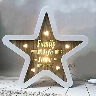 Add a decoration full of character to your home over the festive period with this fabulous Wooden Light Up Star. Complete with its bright LED fittings, this festive plaque will hold a cosy vibe to any room Requires 2 x AAA Batteries (not supplied) Caption: "Family Where Life And Love Never Ends" Free Standing.