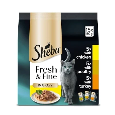 Keep your feline friend interested time after time with delicately sliced pieces, served in a silky Sheba cat food gravy. Always an ideal serving for a fresh taste every mealtime High quality adult SHEBA cat food in gravy providing complete nutrition for your feline companion All Sheba wet cat food recipes have been developed with our nutritionists and veterinarians of WALTHAM CENTRE FOR PET NUTRITION to guarantee 100 percent complete and balanced nutrition Our Sheba cat food pouches have a 100 percent Recyclable outer wrap, helping preserve our environment Sheba chicken and turkey cat food uses high quality, natural ingredients to help give your cat a healthy and delicious meal