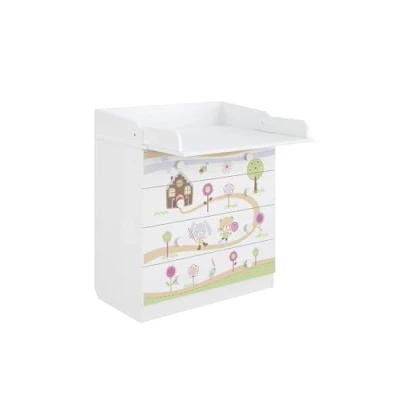 AmazonSpacious baby changing unit – Perfect for nurseries of all sizes, this generous baby changing table provides ample room for comfortable nappy changes without compromising on functionality. Folding changing table top – Easily fold away the baby changing surface to convert the unit into a versatile shelving solution when you no longer need a nappy-changing station. Space-saving dimensions – Measuring just 80 cm (W) × 46 cm (D) × 92 cm (H). Charming décor – Features a whimsical gingerbread-house and candy-themed design, complete with playful animal characters, adding a sweet, storybook charm to your nursery. Sturdy changing table design – Crafted from premium, high-quality materials, our baby changing unit provides a secure, stable surface for worry-free nappy changes. Four spacious drawers – This changing table with drawers keeps all baby essentials—from clothes to accessories—neatly organised and out of sight. Easy-clean surface – Smooth, wipe-clean finish ensures hygiene and quick maintenance, so your nursery always looks its best. Quick and simple assembly – All necessary parts and a clear instruction manual are included, making setup of your baby changing table a breeze.