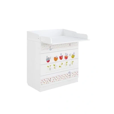 AmazonSpacious baby changing unit – Perfect for nurseries of all sizes, this generous baby changing table provides ample room for comfortable nappy changes without compromising on functionality. Folding changing table top – Easily fold away the baby changing surface to convert the unit into a versatile shelving solution when you no longer need a nappy-changing station. Space-saving dimensions – Measuring just 80 cm (W) × 46 cm (D) × 92 cm (H). Charming décor – Adorned with adorable sleepy kitten motifs nestled in colorful apple blossoms and leafy accents, adding a cozy, playful charm to any nursery. Sturdy changing table design – Crafted from premium, high-quality materials, our baby changing unit provides a secure, stable surface for worry-free nappy changes. Four spacious drawers – This changing table with drawers keeps all baby essentials—from clothes to accessories—neatly organised and out of sight. Easy-clean surface – Smooth, wipe-clean finish ensures hygiene and quick maintenance, so your nursery always looks its best. Quick and simple assembly – All necessary parts and a clear instruction manual are included, making setup of your baby changing table a breeze.