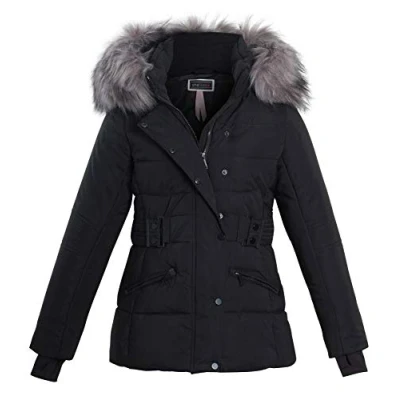 shelikes Womens Faux Fur Quilted Jacket Hooded Belted Winter Warm Parka Coat For Ladies