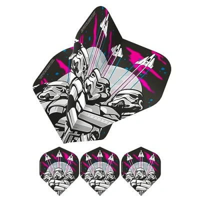 Featuring a striking design of three stormtroopers and their spacecrafts. The flights are constructed from a strong and durable 100 micron material, resulting in a highly consistent performance. Each pack contains 3 flights. Available in Multiple Designs. Dimensions | Width - 45mm | Height - 37mm | Length - 37mm | Weight - 3g