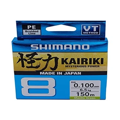 Shimano Kairiki 8 Braid - Braided line with exceptional performance - 8-carrier braid - Polyethylene (PE) layer - Round and smooth - Thin diameter, staggering breaking strain - Very low resistance underwater - Abrasion resistant, no stretch and good colour retention - Suitable for both fresh- and saltwater applications - Perfect for long and accurate casts - Available in different diameters/breaking strain - Japanese top quality line - Colour: Mantis Green - Length: 150 m - Mysterious power! Shimano Kairiki 8 Braid is a unique braid that offers exceptional performance! This 8-carrier braid is a very strong and smooth PE line which is perfect for casting great distances. The very tight weave results in a round and smooth line for optimal accuracy and casting distance. Kairiki 8 Braid is available in different diameters with staggering breaking strains. Give your fishing sessions a new dimension with the mysterious power of Shimano Kairiki 8 braid!