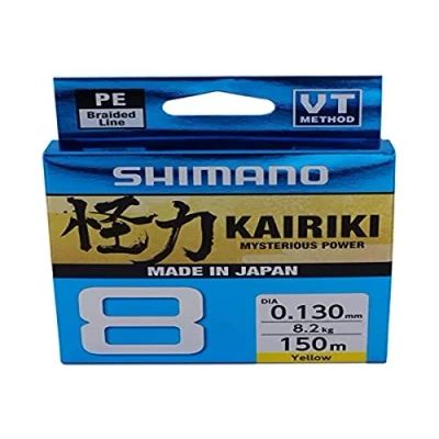 Shimano Kairiki 8 Braid - Braided line with exceptional performance - 8-carrier braid - Polyethylene (PE) layer - Round and smooth - Thin diameter, staggering breaking strain - Very low resistance underwater - Abrasion resistant, no stretch and good colour retention - Suitable for both fresh- and saltwater applications - Perfect for long and accurate casts - Available in different diameters/breaking strain - Japanese top quality line - Colour: Yellow - Length: 150 m - Mysterious power! Shimano Kairiki 8 Braid is a unique braid that offers exceptional performance! This 8-carrier braid is a very strong and smooth PE line which is perfect for casting great distances. The very tight weave results in a round and smooth line for optimal accuracy and casting distance. Kairiki 8 Braid is available in different diameters with staggering breaking strains. Give your fishing sessions a new dimension with the mysterious power of Shimano Kairiki 8 braid!