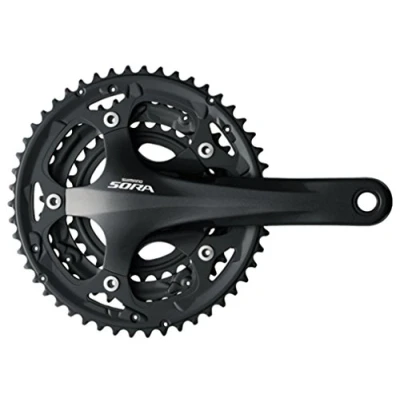 2-piece design double-ring 9-speed chainset from the excellent value Sora range SG-X chainrings feature strategically placed chain pick-up pins and tooth profiles to ensure fast and positive shifting -piece design allows the bottom bracket bearings to be spaced wider apart (outboard the frame) There is also the benefit of easier installation, adjustment and maintenance Compatible with Hyper glide (HG) chains