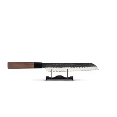 MegacookingworldIt Kurayami Damascus Bread Knife 20 cm from Shinrai is unique, versatile, and a must-have for any true home chef's knife collection. This bread knife not only cuts bread, but its serrations also make it easy to slice through tougher pieces of fruit and vegetables. The serrations of a bread knife mean you don't need to apply as much force when cutting, so this bread knife also provides added safety! Kurayami Kurayami means "darkness" in Japanese and reflects the intense, dark hues that characterize the knives. This unique color scheme gives the set a refined and mysterious look, which not only performs impressively but also makes a stylish addition to your kitchen. Unique features and specifications * 3-layer VG-10 Damascus steel : This Shinrai bread knife stands out for its 3-layer forged steel. Both sides of the blade are made of three layers of the finest Damascus steel. These three layers consist of a hard inner layer and two softer outer layers. This ensures long-lasting sharpness and precision, while also protecting the blades against wear. * Black Bison Horn: The handle of this exclusive bread knife is crafted from black bison horn and premium redwood, a combination that exudes luxury and craftsmanship. This handcrafted knife offers a comfortable grip and a unique design, ideal for discerning chefs who settle for only the very best. An indispensable masterpiece for anyone seeking a high-quality kitchen knife with style and functionality. * Razor-sharp masterpiece : Shinrai's dedication to craftsmanship results in a bread knife that's more than just sharp—it's razor-sharp! Cut with precision, effortlessly, and with a finesse only a true home chef can appreciate. Thanks to its extremely high hardness of 61 HRC, this bread knife can be sharpened to a razor-sharp 15-degree angle. * Balance and ergonomics : This bread knife fits perfectly in the hand thanks to its balanced design. * Serrated bread knife , standard serration : The serrations are all the same height, with the point of the serration pointing outward. Perfect for everyday use. A bread knife with a standard serration is considered the all-rounder among bread knives. * Durability and quality : Made of high-quality Damascus steel. The durability of Damascus steel lies in its strength, wear resistance, and long lifespan. The three layers of forged steel make maintenance easier. A lifelong investment in your culinary journey. * A beautiful gift : This bread knife comes in a beautiful gift box. This not only ensures it's protected on its way to you, but also puts a smile on your face when you receive it. * Warranty : We are completely confident in the quality of Shinrai kitchen knives. That's why we offer a 5-year warranty against material and manufacturing defects! Maintenance tips and recommendations. To keep your bread knife in optimal condition, we recommend washing it by hand with mild soap and warm water. As with any good chef's knife, avoid the dishwasher, as harsh cleaning can quickly shorten its lifespan. After washing, be sure to dry it thoroughly and immediately to prevent stains. Storage Properly storing your knives in a knife block is essential for not only ensuring safety but also extending their lifespan. Storing them this way prevents damage to the cutting edges and ensures they're always within reach when you need them. Correct substrate High-quality cutting boards are essential for keeping your knives sharp and extending their lifespan. They provide a soft, non-abrasive surface that prevents knives from dulling quickly and reduces impact on the blade while cutting. Using high-quality cutting boards is an investment in both the performance and durability of your knives. Ready to make your culinary dreams come true? Order your new bread knife now!