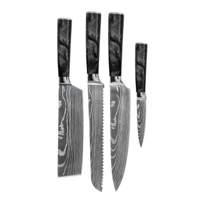 Shinrai Knives Damascus Print Epoxy Onyx 4 Piece Knife Set Chef's + Bread Nakiri Paring