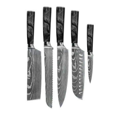 Shinrai Knives Damascus Print Epoxy Onyx 5 piece Knife Set Chef's + Bread Nakiri Santoku Paring