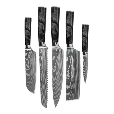 Shinrai Knives Damascus Print Epoxy Onyx 5 piece Knife Set Chef's + Bread Nakiri Small Santoku Paring