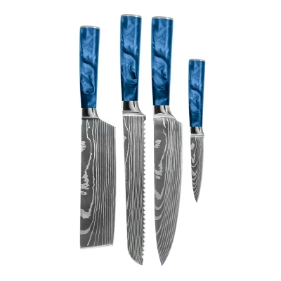 Shinrai Knives Damascus Print Epoxy Sapphire 4 Piece Knife Set Chef's + Bread Nakiri Paring