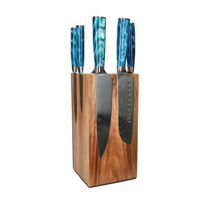 Shinrai Knives Damascus Print Sapphire 6 piece Knife Set + Block Rotate