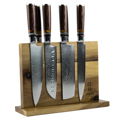 Take advantage of this razor-sharp combination deal and benefit from a big discount! This combination deal contains a 7-piece knife set from the Micarta Jewels Series + a magnetic knife block that is magnetic on both sides. This combination is a real eye-catcher in the kitchen and ensures that your new favorite knives are stored in a stylish way. This acacia wood knife block comes with 7 knives from the Micarta Jewels series that are suitable for various cutting tasks in the kitchen. The combination of pakka wood handles with jeweled micarta rings and an acacia wood knife block will really make the knives stand out. The set consists of: 1x Micarta Jewels Series - 7-piece knife set * 67 layers of VG-10 damask steel * Hardened to 62 HRC Rockwell 1x Magnetic knife block acacia wood double-sided * Durable and strong * Sturdy * Practical and elegant The prices mentioned include a €40 discount. Micarta Jewels Series from Shinrai are unique for every kitchen. This edition of the Micarta Jewels Series has been finished with great precision. The damask steel blade continues into the beautiful Micarta jewel bolster. Micarta is made from several layers of linen that are pressed together with synthetic resin under high pressure. These 3 inlaid jewelery rings provide a unique and beautiful composition. The wood of the handle is made of sustainable pakka wood. In addition, the handle is made in one piece, without rivets. This makes it completely maintenance-free and the risk of cracks or other damage is minimal. * Complete knife set that you can enjoy for at least 30 years. * High-quality damask steel * Beautiful damask pattern * Razor sharp 7-piece knife set * Comes in a luxurious gift box * The best in its price range Comfortable All knives are extremely sharp. The perfect balance makes them fit comfortably in your hand. Cutting food has never been so easy and fun! Handmade in detail Because the knives are handmade, attention has been paid to every detail during production. This way you get the best quality knives. Perfect grip The damask steel blade continues into the beautiful Micarta jewel bolster. Micarta is made from several layers of linen that are pressed together with synthetic resin under high pressure. These 3 inlaid rings provide a unique and beautiful composition. The wood of the handle is made of sustainable pakka wood. In addition, the handle is made in one piece, without rivets. This makes it completely maintenance-free and the risk of cracks or other damage is minimal. A beautiful gift The knives are always delivered in a beautiful gift box. This not only ensures that the knives are protected along the way, but also that it puts a smile on your face when you receive it. VG10 67 layers damask steel The knives from Shinrai are unique as most of them are made by hand. Both sides of the knife consist of 33 layers of the best steel. These layers are placed against a layer of VG10 steel, giving you a knife with 67 layers. This is also called Damask steel. The production technique is centuries old and results in stronger and harder knives. This makes the knives indispensable for every kitchen. Buy the entire knife set today and benefit from an extra discount and free shipping!