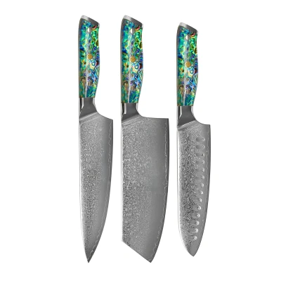 Shinrai Knives Mother of Pearl Jewels 3 Piece Damascus Knife Set Chef's + Nakiri Santoku
