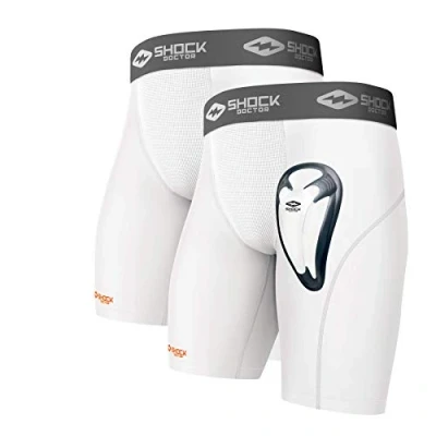 Shock Doctor (2 Pack Compression Shorts with Cup and Pocket for Adult Men Bio Flex Athletic Baseball, Hockey, Softball, Lacrosse, Football, Soccer etc. White
