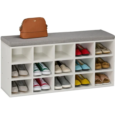 Shoe Bench, 15 Compartments, 50x105x30.5 cm, Padded Seat, for Hallway & Bedroom, Footwear Storage, White/Grey Relaxdays