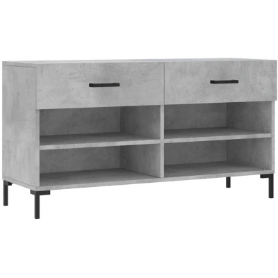ManoManoGeneral description Store your shoes with this stylish and practical shoe bench. It is a perfect choice to keep your shoes organized. Technical specifications Colour: Concrete grey Material: Engineered wood, iron Dimensions: 102 x 35 x 55 cm (W x D x H) Feet height: 10 cm Maximum weight capacity: 110 kg per seat Assembly required: Yes Usage The shoe bench has 2 drawers and 4 shelves, providing ample space for your shoes and other small items. The sturdy top allows you to sit comfortably while taking your shoes off or putting them on. Other information Warning: To prevent it from being overturned, this product must be used with the provided wall attachment device.