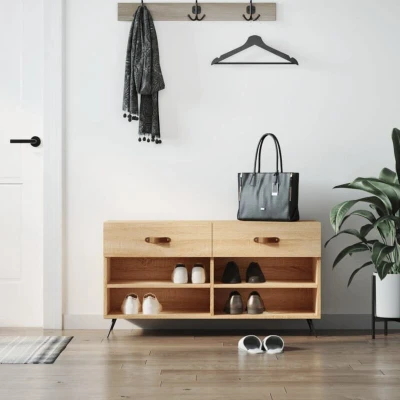 ManoManoGeneral description Store your shoes with this stylish and practical shoe bench. It is a perfect choice to keep your shoes organized. Technical specifications Colour: Sonoma oak Material: Engineered wood, iron Dimensions: 102 x 35 x 55 cm (W x D x H) Feet height: 10 cm Maximum weight capacity: 110 kg per seat Assembly required: Yes Usage The shoe bench has 2 drawers and 4 shelves, providing ample space for your shoes and other small items. The sturdy top allows you to sit comfortably while taking your shoes off or putting them on. To prevent it from being overturned, this product must be used with the provided wall attachment device. Other information