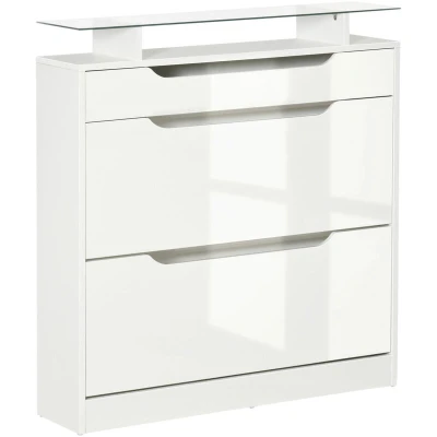 General description Give shoes and more somewhere stylish and protective to keep them - grab this narrow shoe cabinet from HOMCOM. This tall shoe cabinet features a sleek design with a glass top, providing both storage and display space for up to 14 pairs of shoes. Technical specifications Colour: White Material: Particleboard, MDF, Glass Overall Dimension: 89W x 23D x 96H cm Glass Top Size: 89L x 23W x 0.4T cm Height from Glass Top to Countertop: 8 cm Pull-out Drawer Size (inner size): 80W x 19D x 6H cm Flip Drawer Size: 84W x 20D x 9H cm Weight Capacity: 35 kg (overall), 5 kg (drawer), 5 kg (shelf) Item Label: 837-164WT Usage Holds a maximum of 16 shoes, the largest size: UK 8. Ideal for family or shared living spaces. Features two flip drawers and a top shelf for ample storage and display. Glass is easy to clean. Inner shelf panel is adjustable to two different positions. Other information Anti-tipping straps for safety in homes. Assembly required.