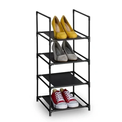 AmazonStorage space: Shoe storage for 1 pair of shoes on each level - ideal for your flat footwear Details: Shoe rack with 4 levels - dimensions HxWxD: approx. 72 x 33 x 33 cm - simply slot together Space-saving: Narrow shoe rack suitable for any niche - for hallways, cloakrooms and dressing rooms Design: Black metal shoe rack with fabric shelves - simple look for many interiors Practical: Open shoe rack for easy, quick access and a good overview of all shoes
