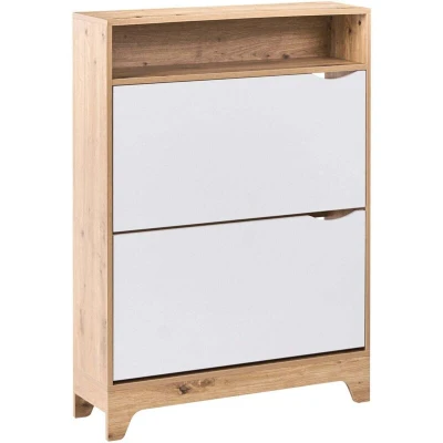 General description This modern shoe storage cabinet in light brown features a practical design that helps keep your hallway tidy. With two tilt-out drawers equipped with dividers, it can hold up to 10 pairs of shoes, ensuring proper organization and easy access. The MDF body with oak-effect melamine and white details gives the cabinet a versatile and stylish look, while its compact design offers extra storage space without compromising on modern aesthetics. Technical specifications Product Type: Shoe Storage Cabinet Style: Modern General Color: Brown, White Shade: Light Brown Material Type: Engineered Wood Main Material: MDF Top Material: Engineered Wood Finish: Melamine Leg Caps/ Pads: Yes Capacity: Up to 10 Pairs of Shoes Dimensions: Depth: 24 cm, Width: 80 cm, Height: 111 cm Weight: 23 kg Top Weight Capacity: 5 kg Installation Full Assembly Required Estimated Assembly Time: 20-40 min Usage Clean with a mild cleaner and a soft cloth Wipe dry after cleaning