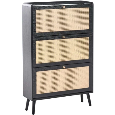 Design Rattan Storage for Shoes. This elegant and functional shoe cabinet is the ideal solution for any entryway, combining style with practicality. Its modern body, made of durable MDF finished with melamine, is contrasted with the unique fronts made of woven rattan. The cabinet features three compartments that can hold up to 12 pairs of shoes in total, helping to keep your space tidy. It's a piece of furniture that perfectly organises the space while adding a natural and trendy accent to the interior. Details: Product Type: Shoe Storage Cabinet General Color: Black, Brown Material Type: Wood Main Material: MDF Additional Material: PE Rattan Frame Material: Engineered Wood Legs material: Engineered Wood Top Material: Engineered Wood Finish: Melamine Leg Caps/ Pads: Yes Capacity: Up to 12 Pairs of Shoes Dimensions: Depth: 24 cm Width: 78 cm Height: 122 cm Weight: 23 kg Top Weight Capacity: 10 kg Offer Includes: 1 x Shoe Storage Cabinet Key Features: Natural Wood Grains and Knots Make