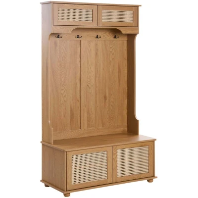 Tall Shoe Cabinet with Hooks. This stylish tall shoe storage cabinet with a coat rack is the perfect addition to any entryway. Made from durable MDF with a melamine finish and featuring rattan Viennese braid fronts, it combines elegance and functionality. The hooks and spacious compartments provide plenty of room for your belongings, keeping your space tidy and organised. Details: Product Type: Shoe Storage Cabinet Style: Traditional General Color: Brown Shade: Light Brown Material Type: Engineered Wood Main Material: MDF Additional Material: Rattan Frame Material: Engineered Wood Top Material: Engineered Wood Finish: Melamine Leg Caps/ Pads: No Capacity: Up to 6 Pairs of Shoes Dimensions: Depth: 47 cm Width: 100 cm Height: 170 cm Weight: 41 kg Top Weight Capacity: 10 kg Offer Includes: 1 x Shoe Storage with Coat Rack Key Features: Safe and Round Shape Hooks, Wood-like Finish for Natural Look, Stable and Durable Construction, High Quality, Plenty of Storage Space Assembly Information: