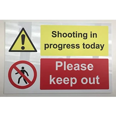 Shooting in progress today please keep out safety sign 3mm Aluminium sign 300mm x 200mm Digitally printed and laminated for extra durability 10mm Radius rounded corners, no sharp edges, Manufacturer: KPCM Display ltd