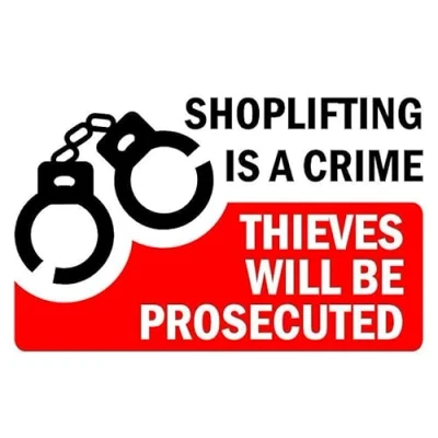 Shoplifting is a crime thieves will be prosecuted sign. Self adhesive sticker. Printed using the latest digital technology and laminated for extra durability. Remove backing film and apply to dry, smooth, oil free surface. All signs come with a 5-year warranty. All our signs are UV resistant meaning they will not fade in sunlight. Our vinyl stickers are temperature resistant from -40°C to +80°C.