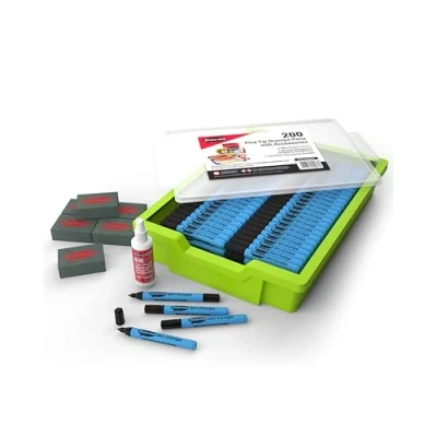 CLEAR ERASABLE WRITING PERFORMANCE - These fine tip whiteboard markers deliver a precise 1.2mm line using deep black ink for sharp, legible writing on all classroom whiteboards. Designed for visibility and consistency, the ink produces strong, easy-to-read lines that support clear communication during lessons, group work and everyday classroom teaching. DESIGNED FOR BUSY CLASSROOM USE - Built specifically for schools, these whiteboard markers feature a massive 3-day cap-off time. Children often leave caps off, but with Show-me technology markers can be left uncapped over a weekend and still work on Monday morning. Even if left uncapped for longer than 3 days, Show-me’s Bounceback Technology allows markers to start writing again after the cap is replaced. COMFORTABLE FOR CHILDREN AND ADULTS - Each marker features a slim blue barrel with a 13mm ergonomic grip zone, designed to be the perfect size for small hands while also remaining comfortable for adults. The fine tip allows controlled, accurate writing, making these whiteboard markers ideal for kids learning to write and teachers who need a fine whiteboard marker for detailed board work. DURABLE NIB WITH NIB-STOP TECHNOLOGY - Children often press hard when writing, which can force standard nibs back into the barrel. These markers include a clever nib-stop that helps prevent the nib being pushed inside, maintaining consistent ink flow. The extra-durable fine tip resists splaying and supports long-lasting performance, even with frequent classroom use. SAFE, REFILLABLE AND SUSTAINABLE DESIGN - Safety air-flow caps reduce risk if swallowed, while the low-odour, xylene and toluene-free ink is supported by a sealed barrel design that helps restrict access to ink for safer classroom use. These markers are refillable for extended use, helping deliver longer-term value. Supplied in a classroom storage tray with a clear lid, this set includes 200 whiteboard markers, 6 mini foam erasers and a 100ml bottle of Show-me Magix whiteboard cleaner.