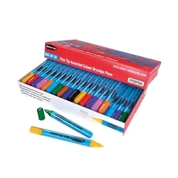 This pack includes 50 fine-tip drywipe markers in assorted colours, providing a vibrant palette for creative expression and effective teaching. The selection comprises five markers each of Black, Dark Blue, Brown, Green, Light Blue, Orange, Pink, Purple, Red, and Yellow. This variety enables students and teachers alike to utilise colour coding and visual aids effectively in their lessons.