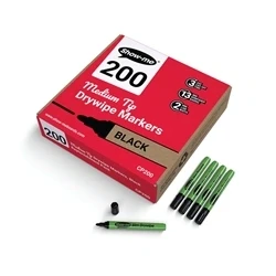 Medium tip drywipe marker. Slim barrel. Low odour, xylene-free ink. Safety air flow cap. Cap Off Time: Up to 24 hours. Extra hard anti-splay nib. One piece barrel. Colour: Black. Pack of 200.